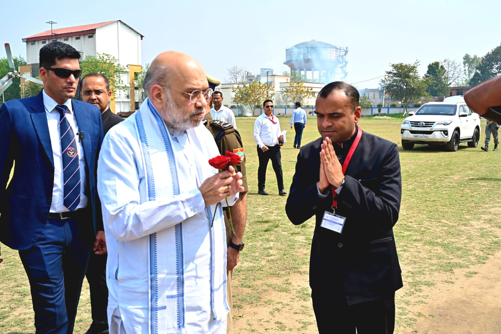हेली पैड पर केन्द्रीय गृह मंत्री का स्वागत करते हुए जिलाधिकारी मयूर दीक्षित एवं वरिष्ठ पुलिस अधीक्षक नवनीत सिंह भुल्लर